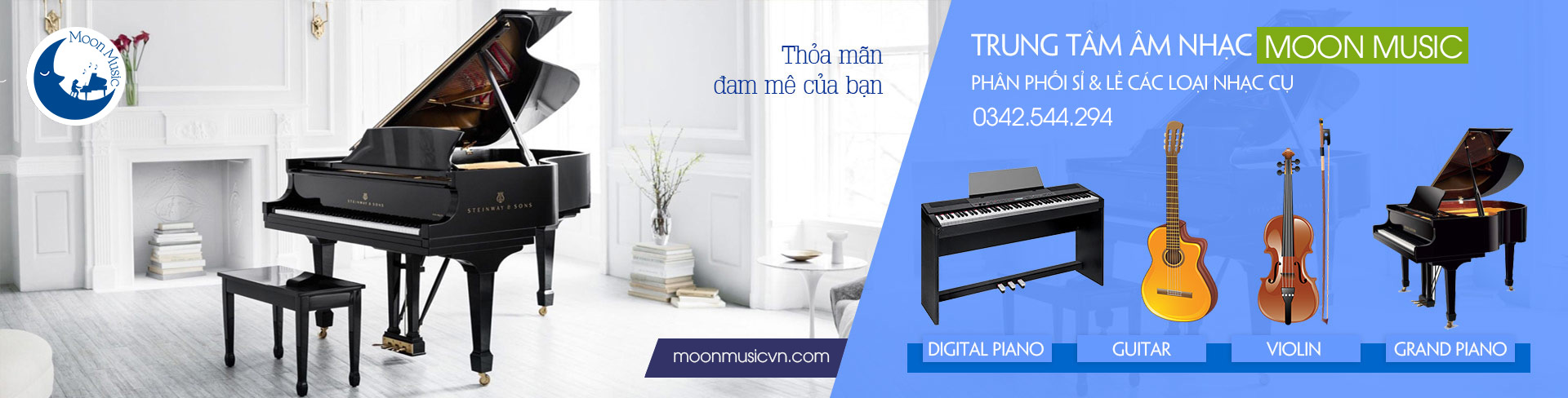 Moon Music cung cấp sỉ và lẻ các loại nhạc cụ như: Grand Piano, Upright Piano, Đàn Organ, Đàn Guitar, Đàn Violin, và nhiều loại nhạc cụ khác